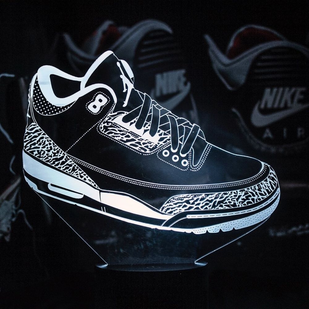 Lampe LED Air Jordan 3 avec changement de couleurs. Nos lampes LED Sneakers sont composées d’une plaque en acrylique de 4 mm d’épaisseur gravée au laser et d’un socle. Une fois insérée la plaque acrylique dans le socle, vous pourrez changer les couleurs de votre lampe simplement en touchant le socle. Si vous êtes un Sneakerhead, cette lampe est parfaite pour apporter une touche de lumière à votre collection. Nous proposons un large choix de design avec les derniers modèles de baskets tendances (Air Max, Air Jordan, Yeezy et …).